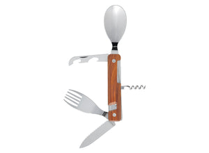 Bestehend aus einem großen Löffel, einer 5-zinkigen Gabel, einem Messer mit mikrogezahnter Klinge, einem 4-Spiral-Korkenzieher, einem Dosenöffner und einem Flaschenöffner