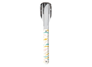 Bestehend aus einem großen Löffel, einer 4-zinkigen Gabel und einem Messer mit mikrogezahnter Klinge
