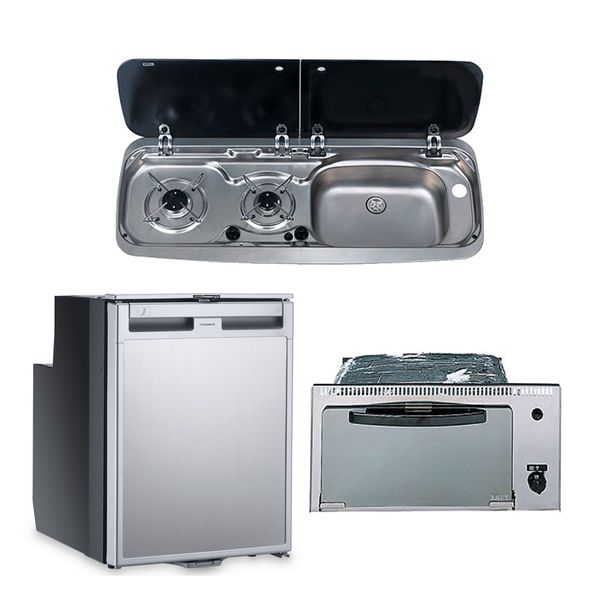 Dieses Paket wurde speziell für den Umbau von Wohnmobilen entwickelt und besteht aus einem Kompressorkühlschrank, einem Minigrill mit LPG-Piezozündung und einer Kombinationseinheit mit einem Doppelkochfeld auf der linken Seite und einer Spüle auf der rechten Seite. Der Dometic CRX50-Kompressorkühlschrank in diesem Kit bietet alles ein großzügiges Fassungsvermögen von 45 Litern. Er verfügt über eine Tür in Edelstahloptik und einen patentierten herausnehmbaren Gefrierschrank, der sich leicht herausziehen lässt, um den Platz im Kühlschrank zu optimieren. Die gewünschte Temperatur kann über das Soft-Touch-Bedienfeld an der Innenwand des Kühlschranks eingestellt werden. Die abgeschrägte Kante an der Rückseite des Kühlschranks sorgt für eine optimale Nutzung des Platzes an Bord. Dieses CRX50-Modell passt seine Lüftergeschwindigkeit automatisch an die Umgebungstemperatur an und erzeugt so minimale Geräusche. Der Dometic Smev 555 Minigrill in diesem Kit ist ein kompaktes, einfach zu bedienendes Gerät, das mit Flüssiggas mit Piezozündung betrieben wird. Dieser aus Edelstahl gefertigte Grill verfügt über eine Tür mit Scharnieren am Boden aus schwarzem Glas und ein Sicherheitszündsystem. Das Kochfeld und die Spüle in diesem Paket verfügen über zwei schwarze Deckel aus gehärtetem Glas, die im geschlossenen Zustand zusätzliche Ablagefläche bieten. Diese Deckel können bei Bedarf auch einfach abgenommen werden. Das Kombigerät Dometic 9222 verfügt über zwei Gasbrenner mit Piezozündung auf der linken Seite und eine Spüle auf der rechten Seite. Das Kochfeld verfügt über verchromte Topfträger mit emaillierten Brennerdeckeln und das Gerät misst insgesamt 900 mm (B) x 152 (H) x 370 (T). Kühlschrank – Modell: CRX 50 – Spannung: 12 oder 24 V – Wattzahl: 40 W – Kapazität: 45 Liter – Stromstärke: 5 A – Zulassungen: T†V/GS – Gewicht: 17 kg – Abmessungen: 534 mm (H) x 380 (B) x 447 (T) – Verbrauch: 1,1 A/Std. +20 °C Umgebungstemperatur, 1,7 a/h bei +32 ¡C UmgebungstemperaturGrill – Modell: Smev VN 555 – Zündung: Piezo – Abmessungen: 240 mm (H) x 485 mm (B) x 410 mm (T) Kombigerät – Modell: 9222 – Zündung: Piezo – Wattzahl: 1,8 kW (x1), 1 kW (x1) – Gesamtleistung: 2,9 kW – Gewicht: 5,8 kg – Abmessungen: 152 mm (H) x 900 (B) x 370 (T) – Ausschnitt: 793 x 307 mm