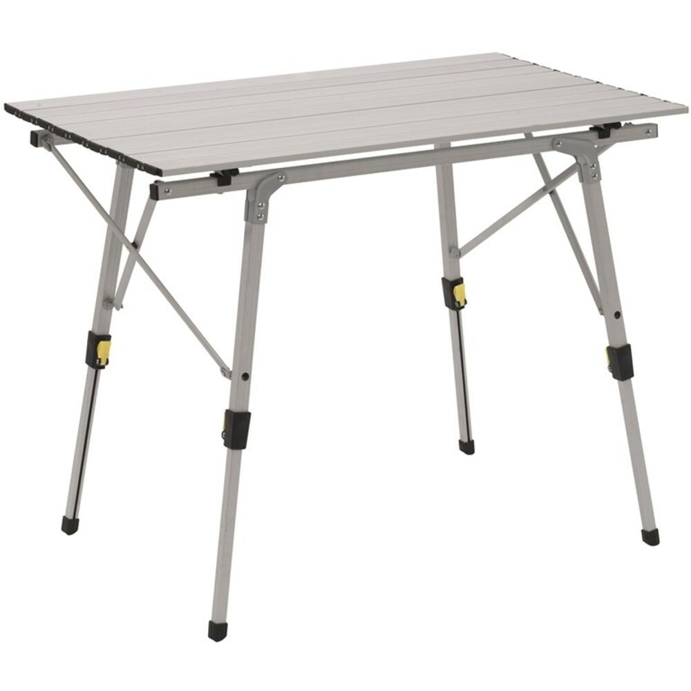 Ein gut aussehender Tisch mit einer aufrollbaren Aluminiumplatte in grauer Farbe. Es verfügt außerdem über Teleskopbeine, die bei Nichtgebrauch eingeklappt werden können.