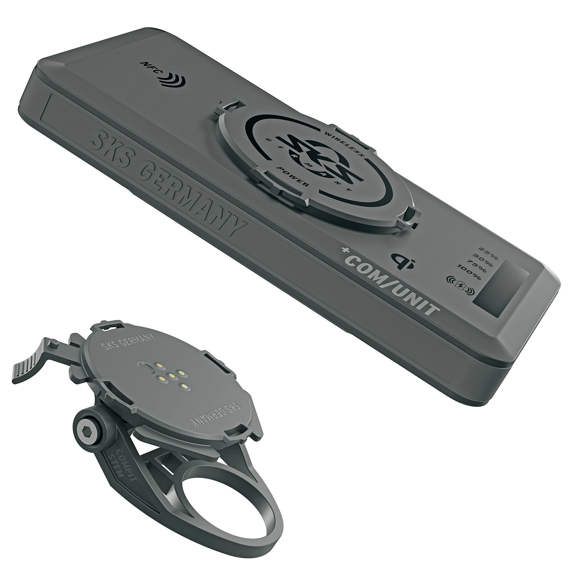 Für zusätzliche Energie! Der COMPIT/STEM+ zur Vorbaumontage besteht aus einer Smartphone-Halterung und einer Powerbank mit integriertem NFC-Chip. Jedes mobile Gerät, das mit einer kabellosen Ladefunktion ausgestattet ist, kann an die +COM/UNIT angeschlossen und unterwegs aufgeladen werden. Mit einem einzigen Dreh lässt sich das Smartphone dank der übergroßen Bajonetthalterung horizontal oder vertikal montieren.