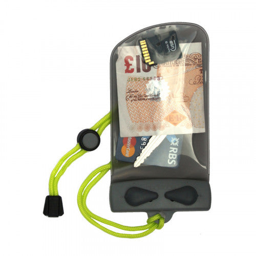 A small waterproof bag for protecting small but vital essentials. Take your car electronic key, cash and credit cards out on the water with you! This is a submersible waterproof pouch which is perfect for protecting the essential items you can’t leave safely. Hotel room keys, car keys and cash are all safe, and the case is so small that it fits in a pocket or inside a wetsuit. Key Features Guaranteed waterproof to 165ft/50m Use all buttons and switches through the case A perfect fit for Asthma inhalers Also protects from dust, dirt and sand Like most of our cases it’ll float if you drop it in the drink The seams are high-frequency welded to form a super-strong bond. The Aquaclip® (a patented, ultra-secure, rustproof, injection-moulded plastic seal) opens and closes with a simple twist of two levers, and everything stays in one piece even when open. Tech specs Colour: Cool grey with acid green lanyard Materials: 300mu UV-resistant TPU Weight: Case: 0.8oz / 24g Lanyard: 0.2oz / 7g Country of Origin: Made in the UK.