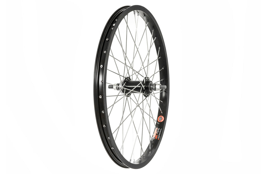 Rear BMX wheel 20" black 3/8" nutted axle. Using a high flange alloy hub and built onto a lightweight alloy Alex DM24 36h rim, this wheel is an ideal upgrade to any BMX bike.