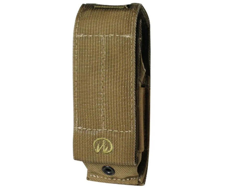 This brown, nylon MOLLE system sheath features snap webbing strap for attachment on backside. Has brown Leatherman logo and Velcro front closure.
